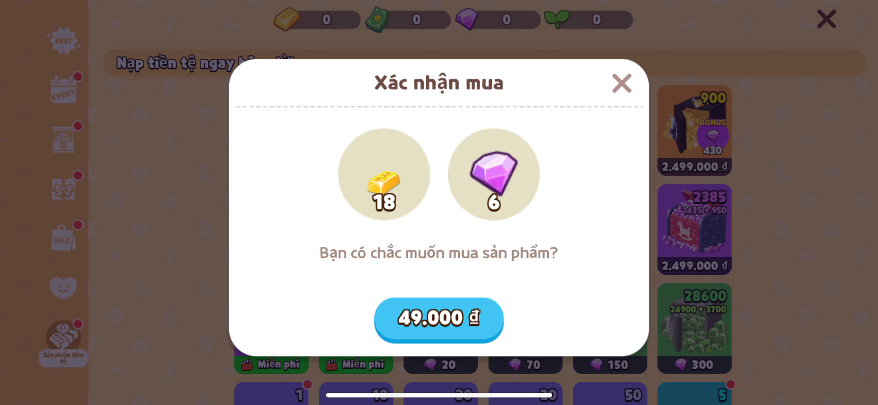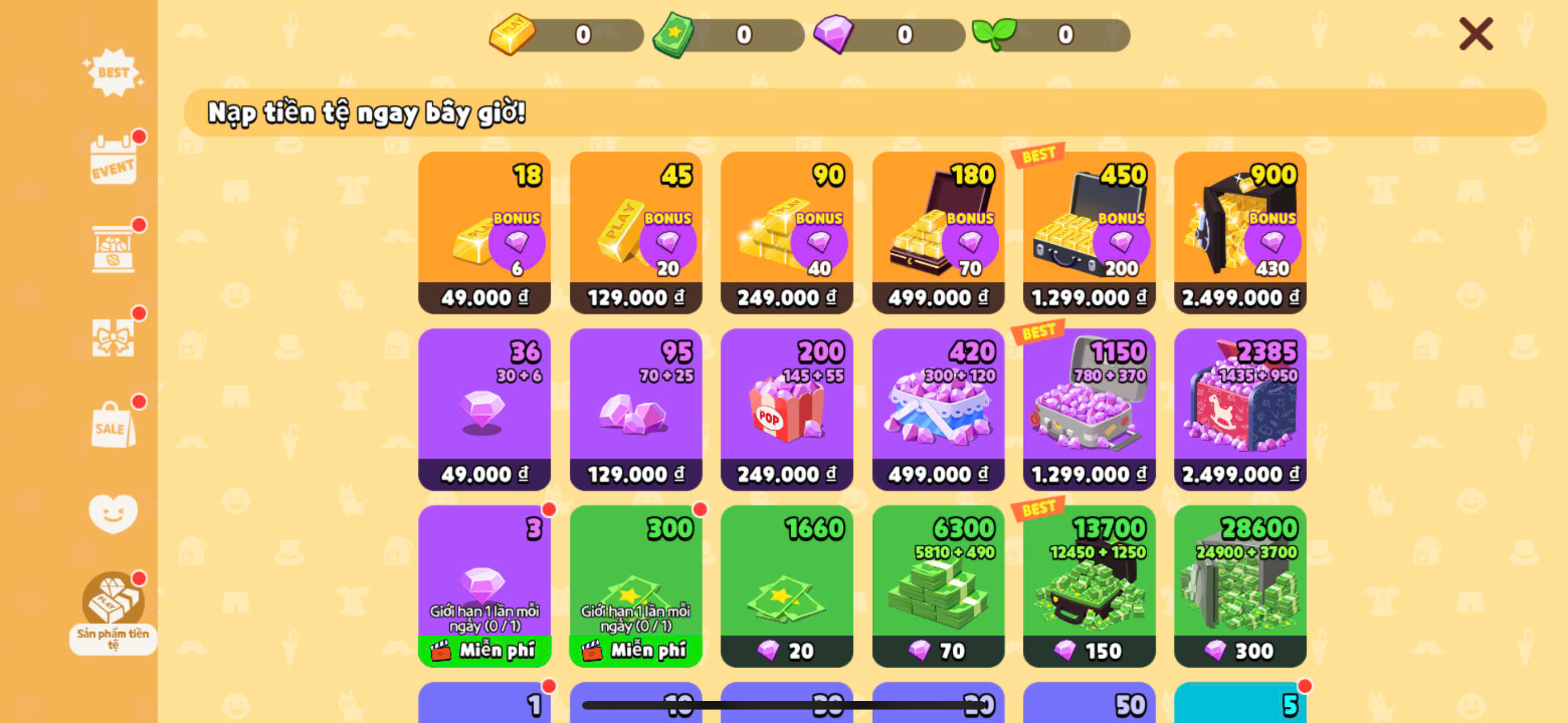 Chọn gói Kim cương hoặc gói Tiền sao (Star) mà bạn muốn nạp. Game sẽ hiển thị giá và các ưu đãi kèm theo (nếu có).