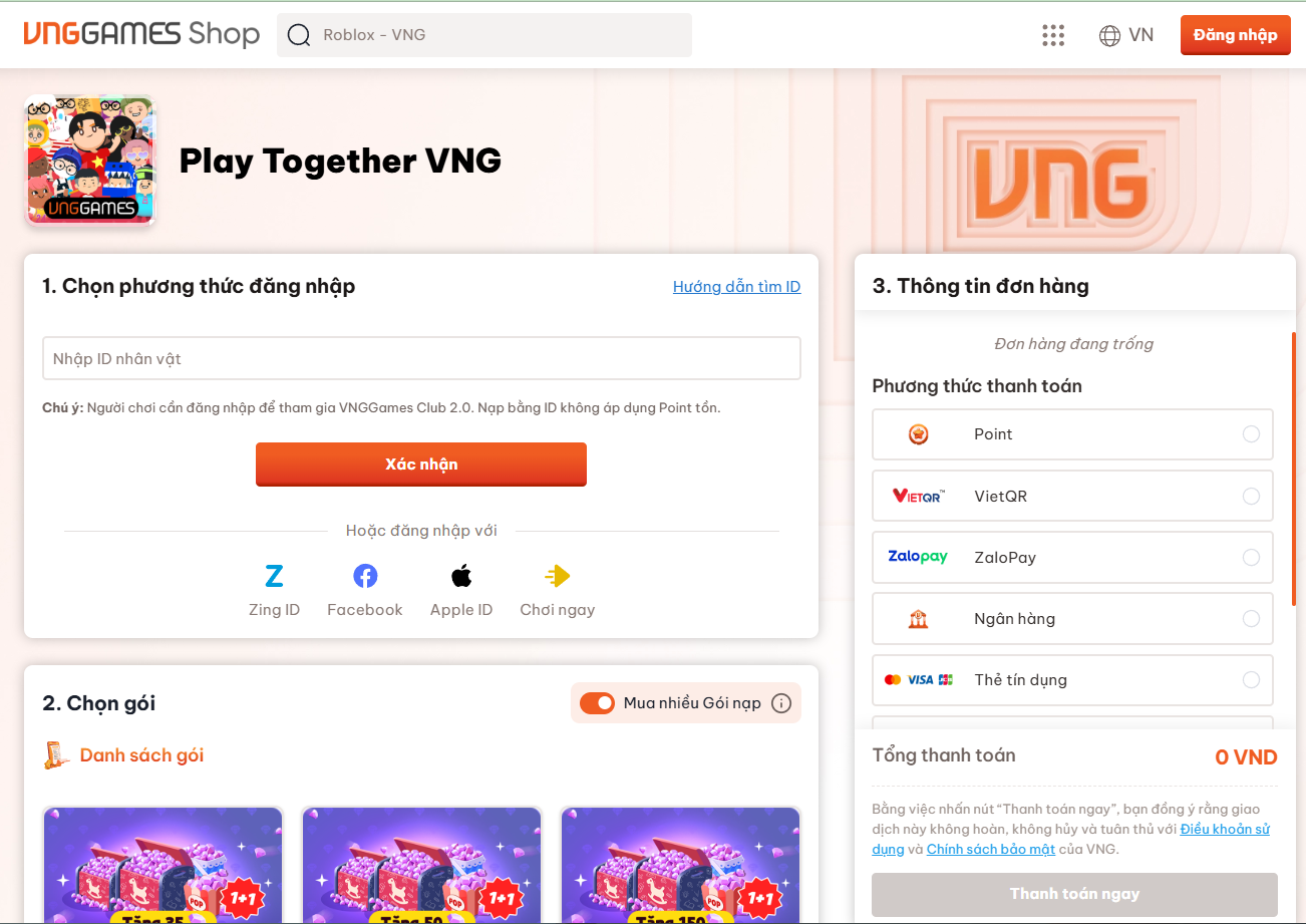 Nạp qua cổng thanh toán của VNG Games (nhà phát hành Play Together) là cách phổ biến và thường có nhiều ưu đãi hơn.